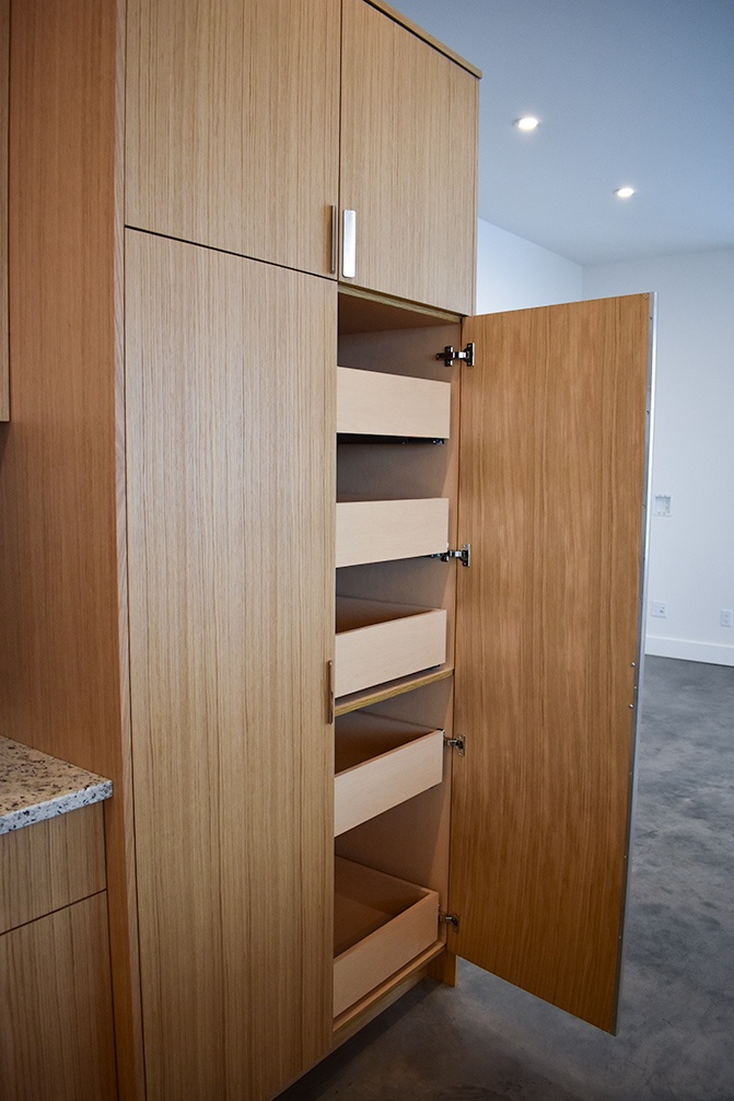 The architects designed the house, and we worked with them on room layout specifics and interior design, as well as cost planning and construction. Located up by Nelson’s rail trail, this home takes full advantage of the lovely vistas of the lake and surrounding mountains. The style is clean and contemporary, with a natural colour palette and materials like white oak, granite, and concrete. We kept the tones on the lighter side and added some richer accent colours for contrast.