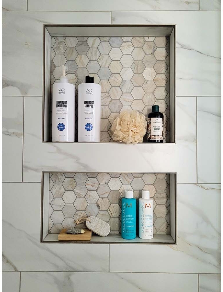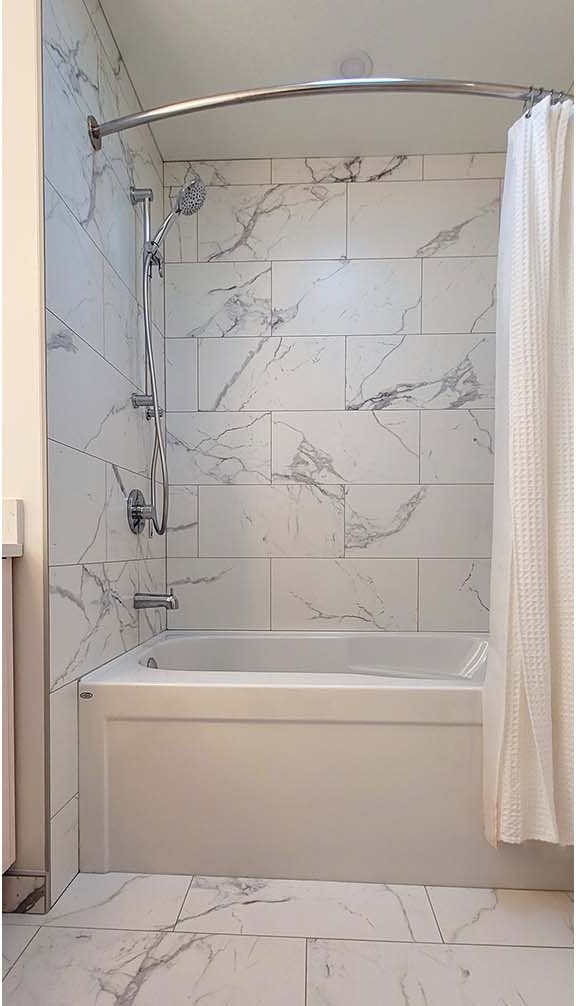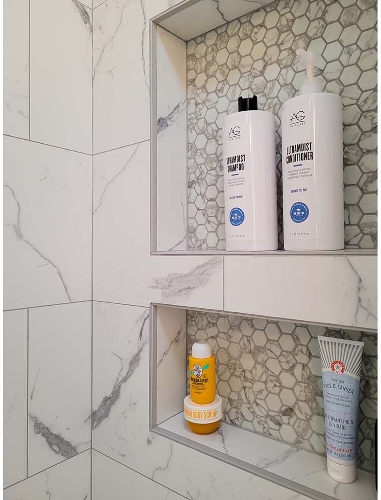 The second renovation, finished in 2022, brought the remaining spaces in the home up to the style level of their lovely kitchen. The Den had a large rustic corner fireplace which dominated the room and made it difficult to furnish. The new fireplace wall created space for the owner’s bookshelves and furnishings. The Den’s materials were selected to blend in with the adjacent kitchen and great room. The lower floor was refreshed with new finishes, plus we replaced the t-bar ceiling with drywall. For the three Bathrooms, we kept the plumbing locations as-is, but changed the fixtures and finishes for a fresh new look. New lighting throughout, including illuminated mirrors, made the spaces much brighter. We also added two new sun tunnels in areas without natural light.