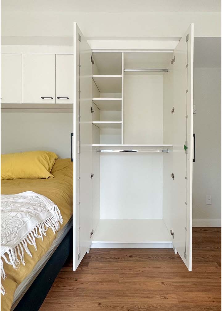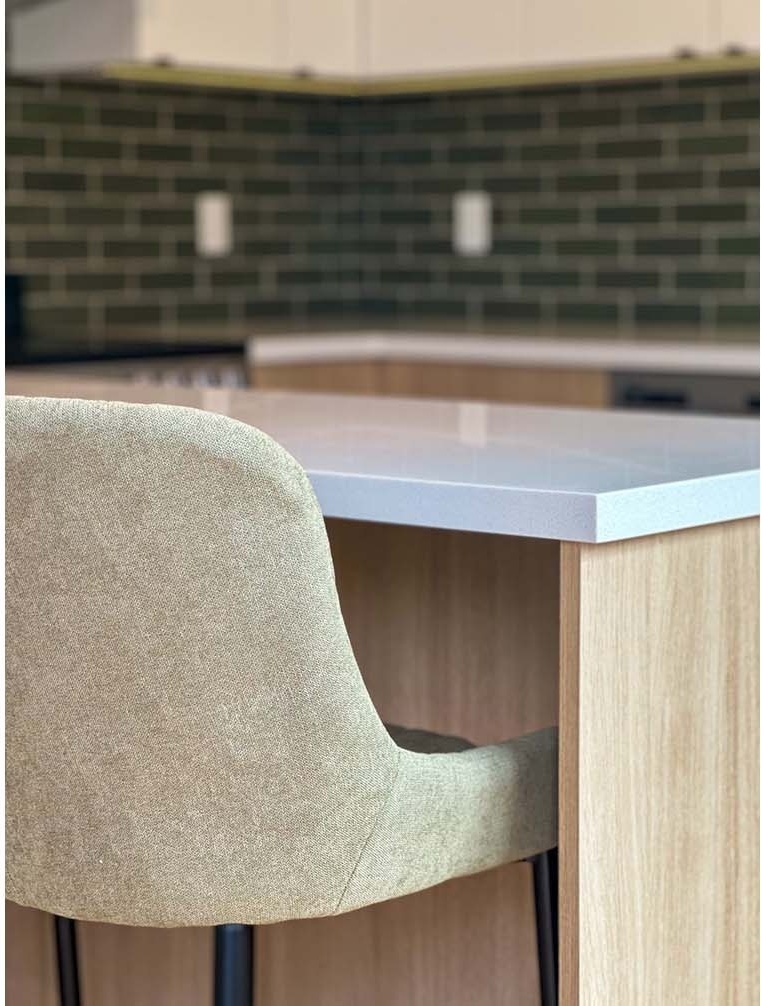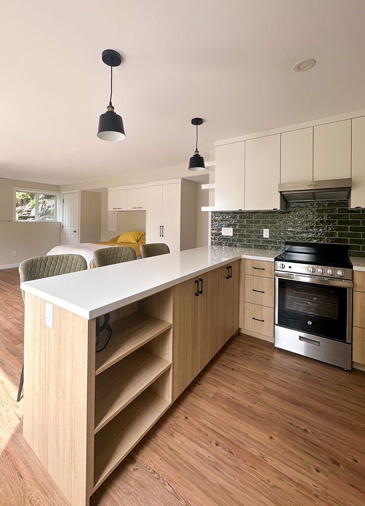 The white painted upper cabinets and custom bed surround look fresh and modern while the wood-look laminate base cabinets warm up the space. The green tones of the kitchen and bath backsplashes provide lovely accent colours that tie in with the beautiful gardens outside. The cork-backed vinyl plank flooring will be easy to care for and will provide some insulation underfoot. This tidy new suite will be a lovely haven for this family!