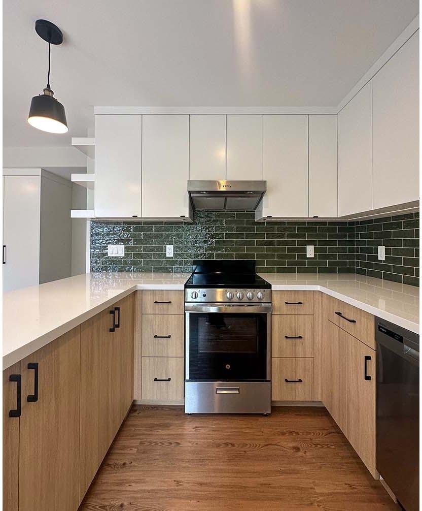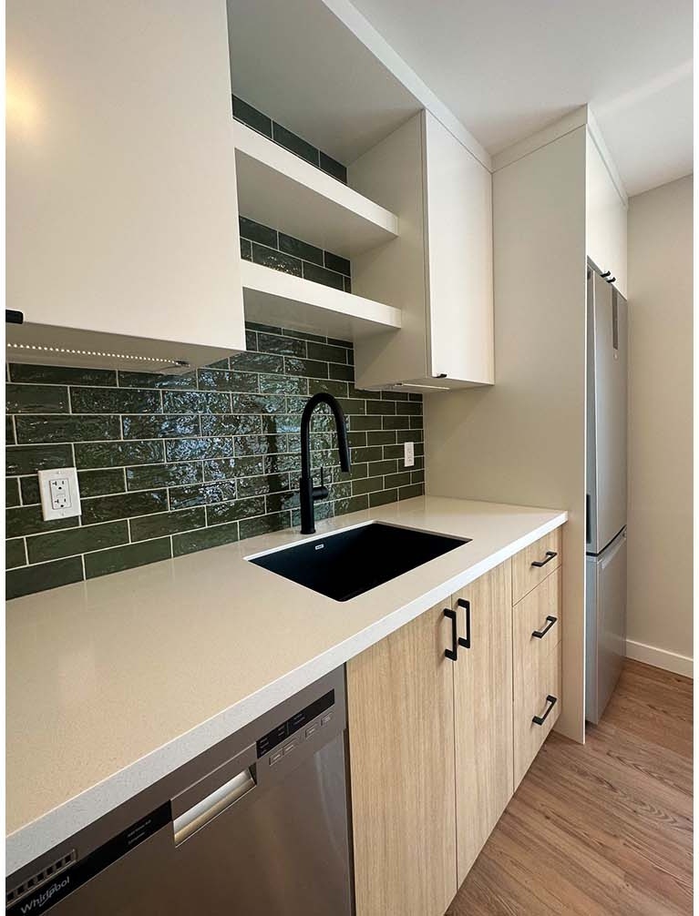 Existing window and door locations were kept as-is, but we removed some walls and bulkheads to create a bright, open living space. They layout of the kitchen and bathroom were also reworked to create better spatial flow. The euro sized appliances suit the compact kitchen layout, making it feel more open. A new larger shower in the bathroom improves both style and accessibility, plus a larger vanity increases bathroom storage and counterspace.
