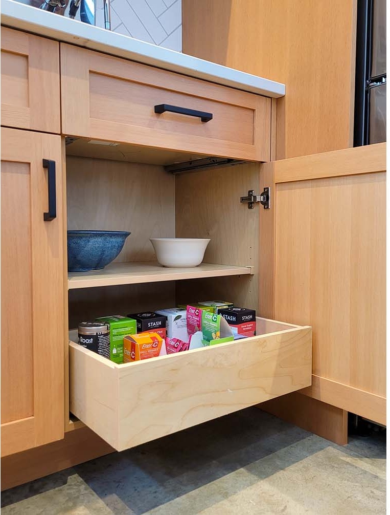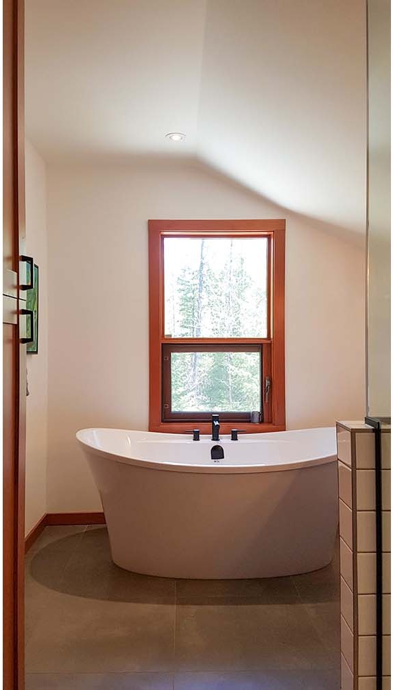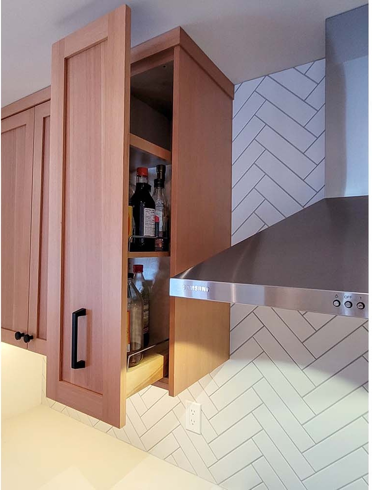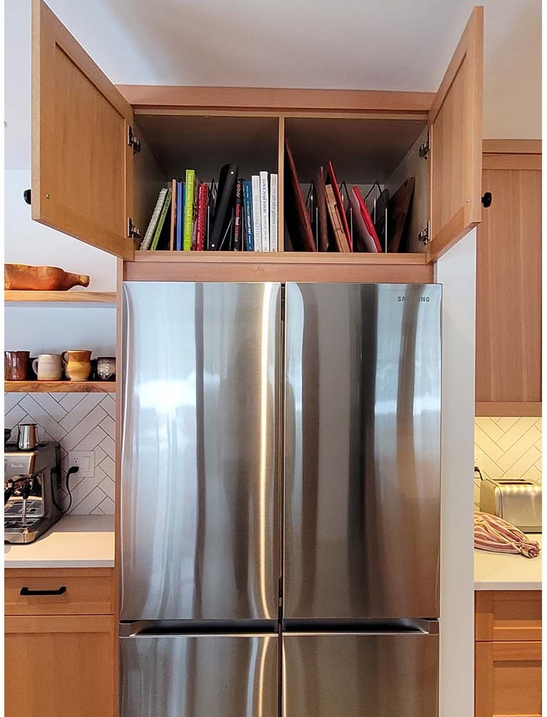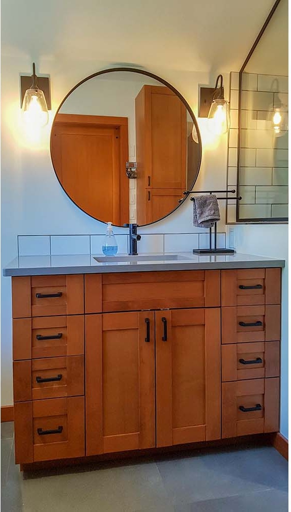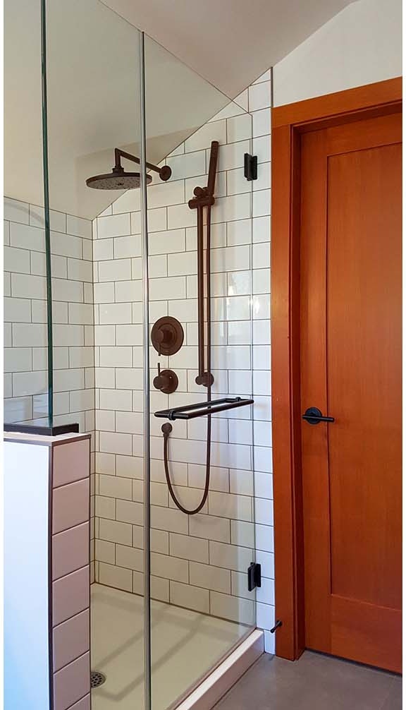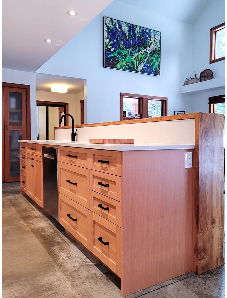 The third project was the design & build of the new kitchen at the main house. Counterspace was a challenge for these homeowners, so we shifted the fridge to the other side of a service wall to lengthen their range-wall cabinet run. We also extended the island for more workspace. On the far side of the fridge, we added a built-in beverage area and dining bench with storage drawers underneath. The new live-edge cherry breakfast bar hides any kitchen mess from the adjacent living area. The floating shelves at the beverage area match the breakfast bar. The owners still wanted wood, so the new shaker-style cabinets are clear fir, to tie into other fir finishes in the home. New pale concrete-look quartz countertops suit the existing concrete floors. The herringbone pattern of the backsplash tile adds some visual texture to the space. New discrete recessed lighting keeps the space bright and uncluttered. This new kitchen has a similar feel to the original, but it’s brighter and better for the whole family to work together.