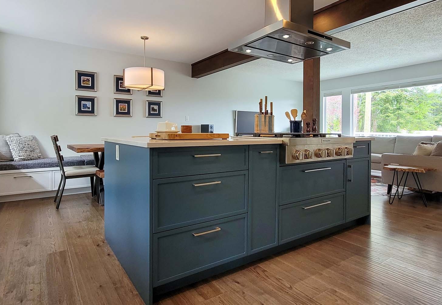 This third project included a new pantry / kitchen / dining area with new wood flooring throughout the main level. We removed a structural wall and added a new wood-clad post and beam to open up the space. The clients really enjoy cooking and this new kitchen includes their dream appliances and special storage features. We removed an unused patio door in the dining room which compromised their privacy, and added a built-in buffet and a dining bench with storage underneath to maximize floor space and storage. The space was already very bright, so the loss of the door wasn’t an issue. New lighting provides layers of illumination to suit various uses and moods.