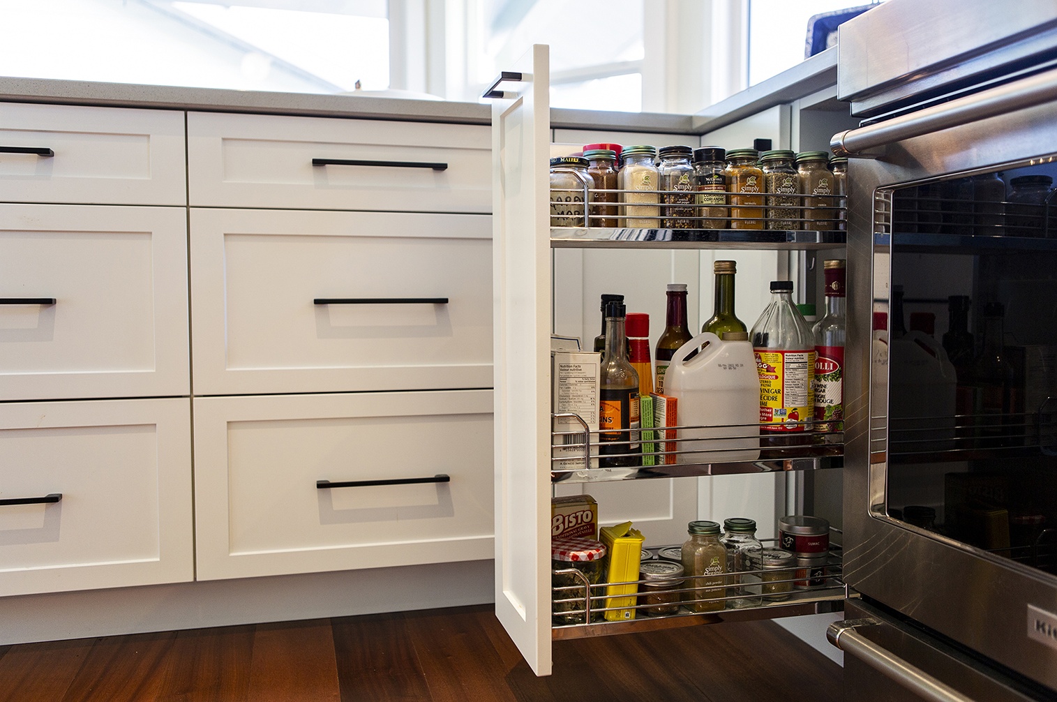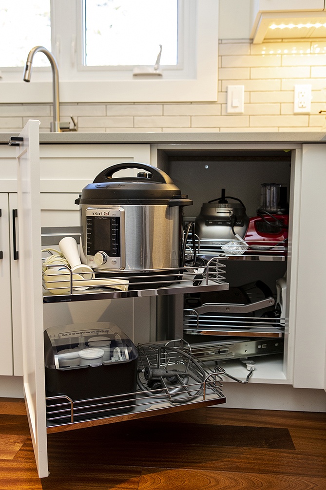 The eat-in kitchen in this home was bright, but felt a bit compact. The peninsula hood fan was also a big visual barrier to the views. The space was too narrow to allow an island, so we pushed the peninsula into the eating area leaving space for bar stools. Because there is a larger dining area right outside the kitchen, the clients have not missed the kitchen table. We added tall pantry cabinets for more storage, plus some pretty display. We relocated the range to keep the vent hood out of the main view, which created space for a sculptural light fixture. The new lighter toned cabinets and countertops brighten the space while the merbau wood flooring warms it up and flows out to match the rest of the home. The long brick format of the backsplash tiles matches the bricks in the adjacent dining/living area’s fireplace.