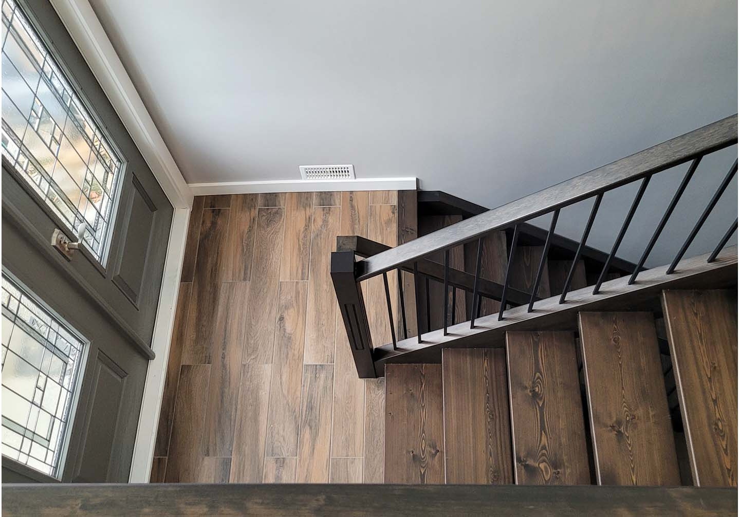 We added several new windows and large patio doors in the living and dining areas to brighten the great room and take better advantage of the lovely views. We removed the kitchen walls and a door to the backyard to improve workflow and make the new kitchen feel more open. The great room’s fireplace was re-clad with new stone to blend in with the new finishes. The stairs and railings were re-done in a more modern/open style to let more light into the basement. All three bathrooms were updated and closets throughout were fitted with new organizing systems. New lighting layouts and fixtures keep the spaces bright. New flooring throughout will withstand busy family traffic for years to come.