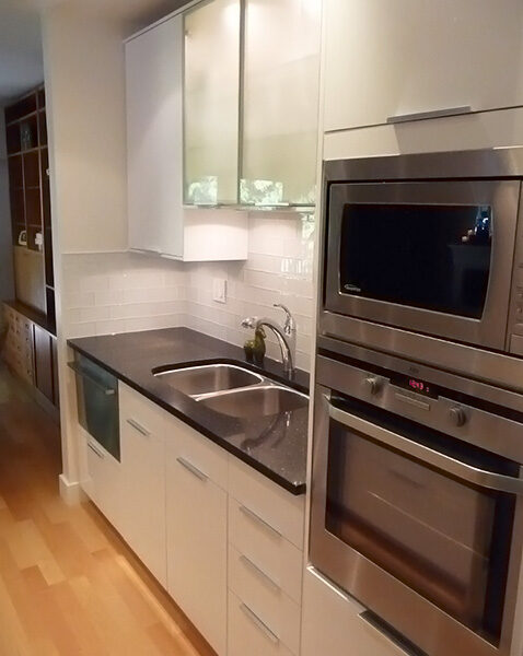 We removed several walls, improved the lighting, adjusted the appliance locations and replaced the dated millwork with a more contemporary style. Now this is an open and interactive kitchen!
