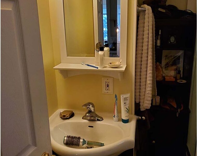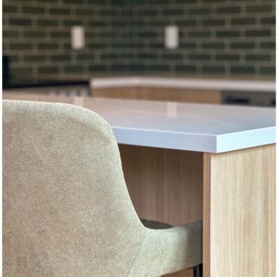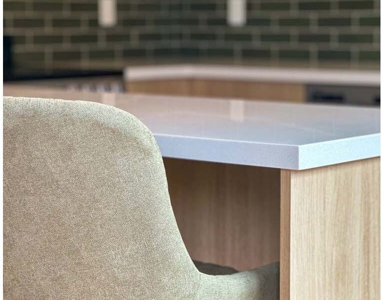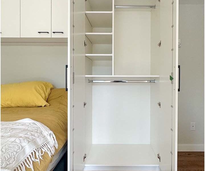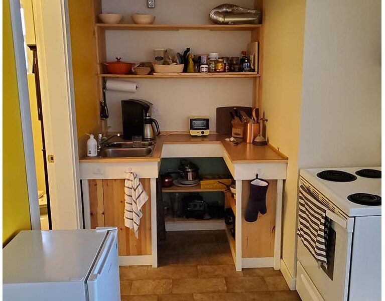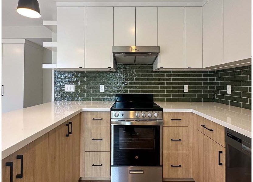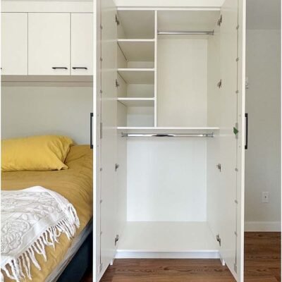 The white painted upper cabinets and custom bed surround look fresh and modern while the wood-look laminate base cabinets warm up the space. The green tones of the kitchen and bath backsplashes provide lovely accent colours that tie in with the beautiful gardens outside. The cork-backed vinyl plank flooring will be easy to care for and will provide some insulation underfoot. This tidy new suite will be a lovely haven for this family!