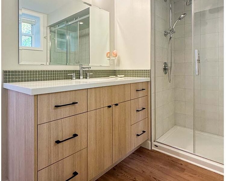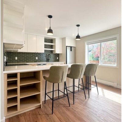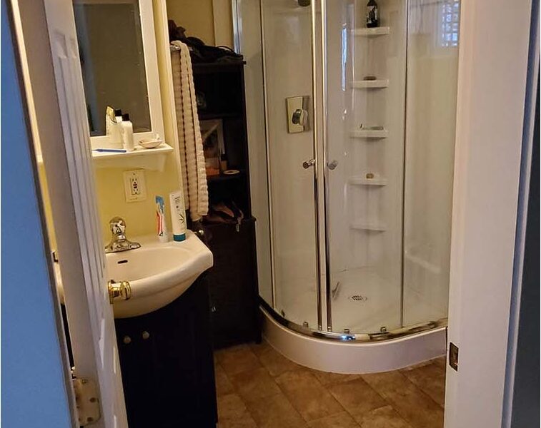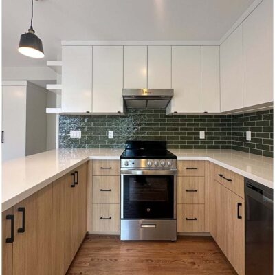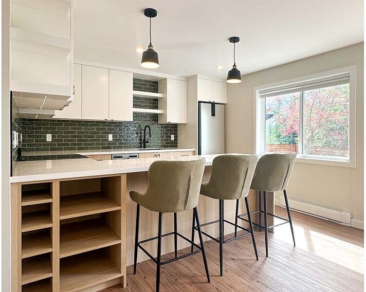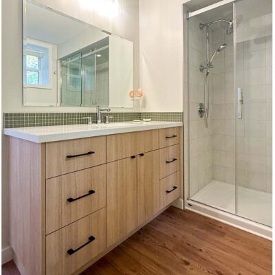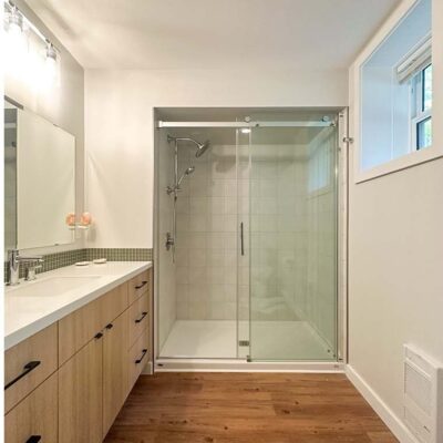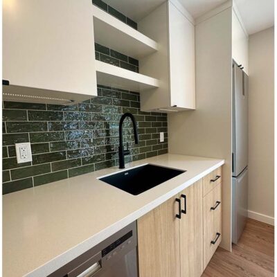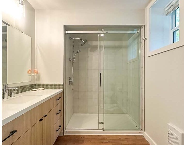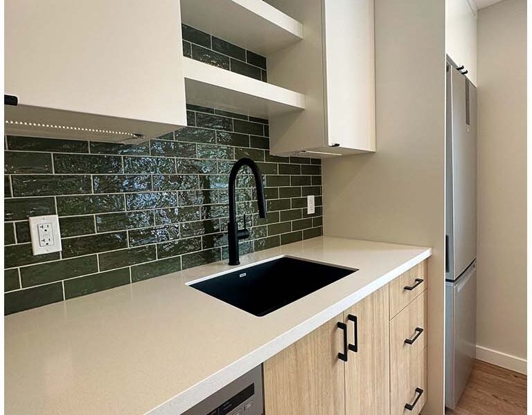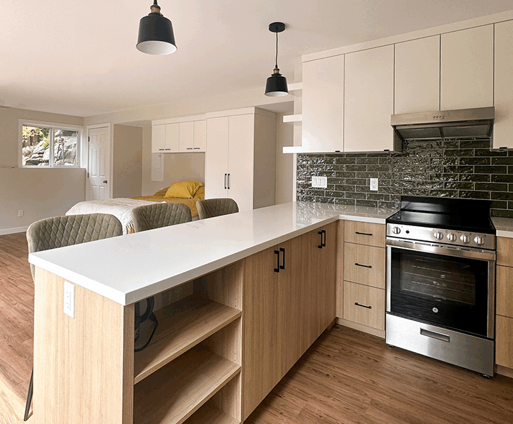 This family wanted to renovate their basement to create a private suite for their mother in law. Existing window and door locations were kept as-is, but we removed some walls and bulkheads to create a bright, open living space. They layout of the kitchen and bathroom were also reworked to create better spatial flow. The euro sized appliances suit the compact kitchen layout, making it feel more open. A new larger shower in the bathroom improves both style and accessibility, plus a larger vanity increases bathroom storage and counterspace.